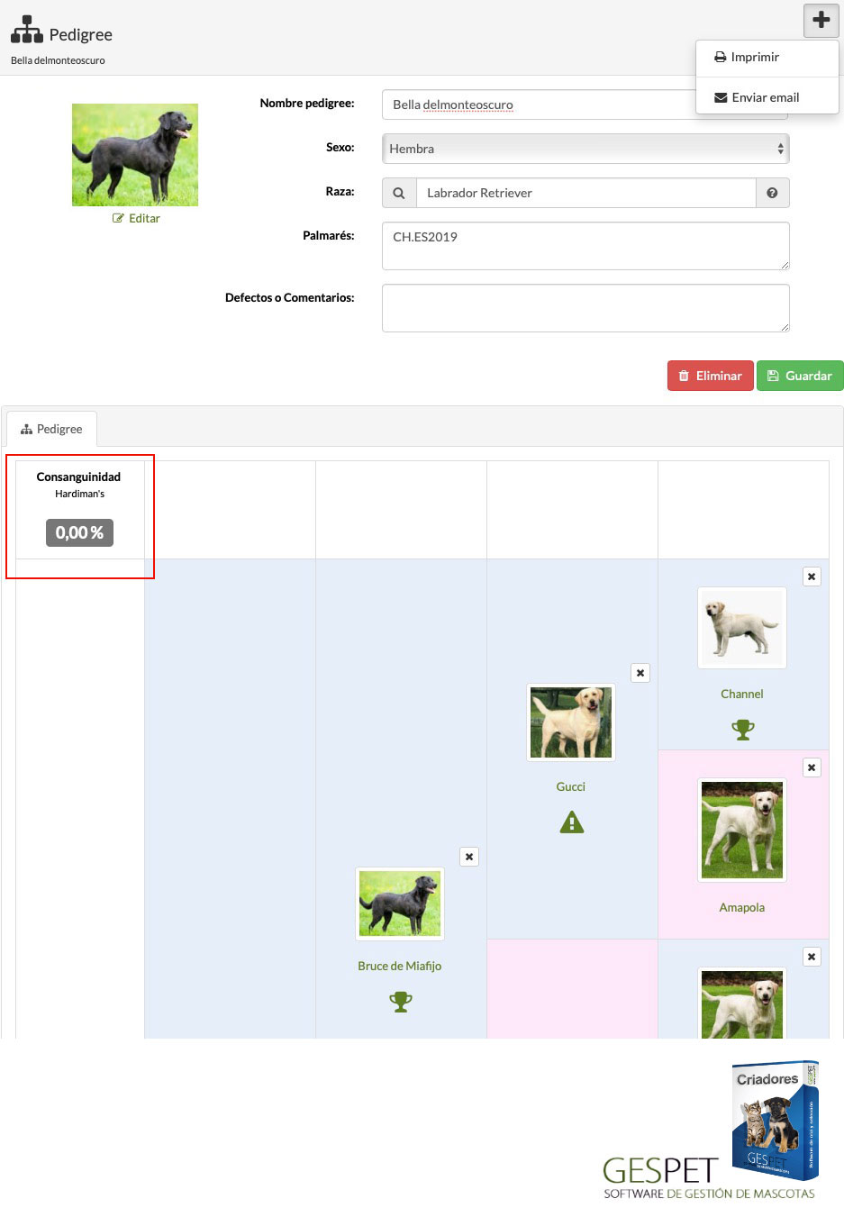 En la esquina superior izquierda aparece el porcentaje de consanguinidad (El software recorre la línea genética para ver los progenitores comunes y el grado. Esta consanguinidad se calcula utilizando la formula de Hardiman's y se expresa en porcentaje. Por ejemplo la consanguinidad es el 10%.)