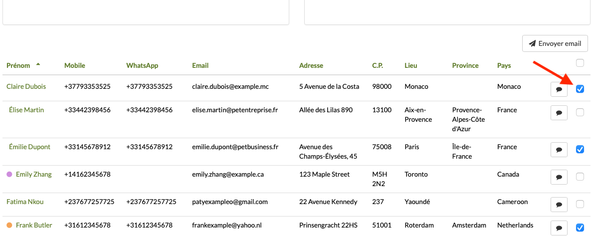 Sous les graphiques se trouve la liste. Si vous cliquez sur la case de sélection de l'en-tête du tableau pour leur envoyer un email, tous sont sélectionnés.