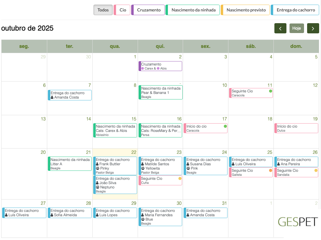 Os cios são registados automaticamente (data de início, data de fim e cio previsto ou futuro), os cruzamentos, o nascimento previsto de ninhadas planeadas ou futuras, o nascimento real das ninhadas e a entrega programada dos cachorros.