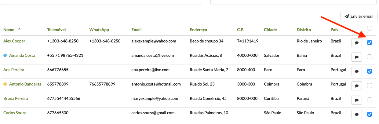 Debaixo dos graficos esta a lista. Se clicar na caixa de selecao do titulo da tabela para lhes enviar o email, ficam todos selecionados.